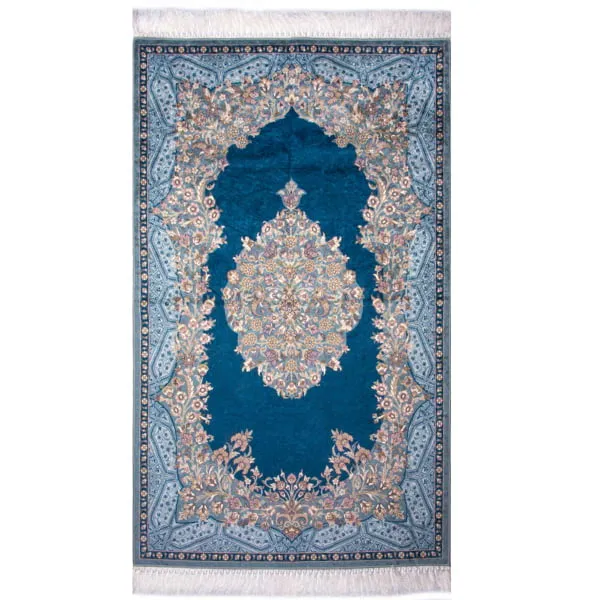 Preciosa alfombra Seccade modelo Turkuaz, con tono azul que enmarca el motivo central con flores.