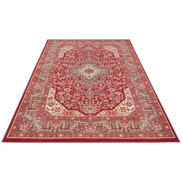 Elegante alfombra turca Karakaya, con un diseño en tonos rojos y granates, que le dará a tu salón o habitación un toque hogareño y cálido.
