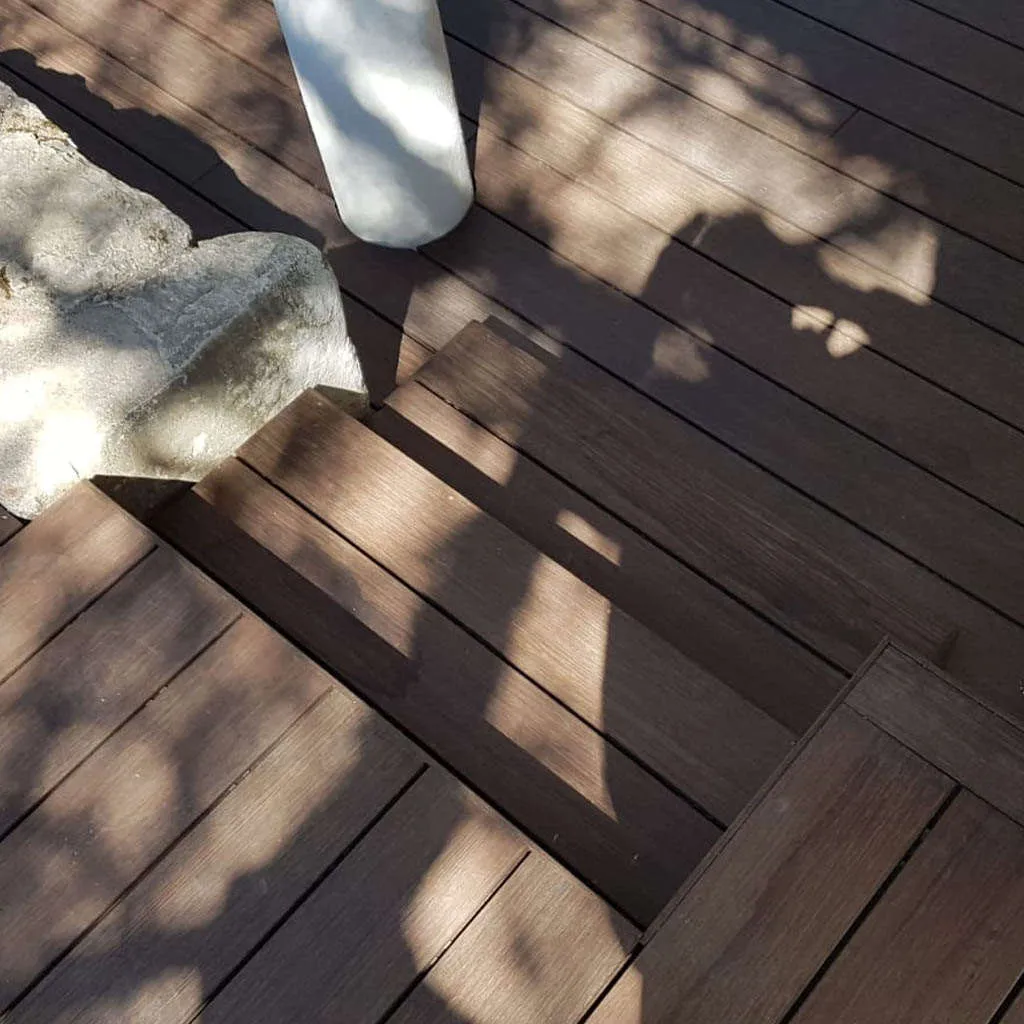 El suelo exterior de madera de bambú de la colección Eurobamboo ofrece la más alta calidad y resistencia. La estética del tablón, con acabado en marrón oscuro liso y sin ranura, aporta elegancia a cualquier espacio.