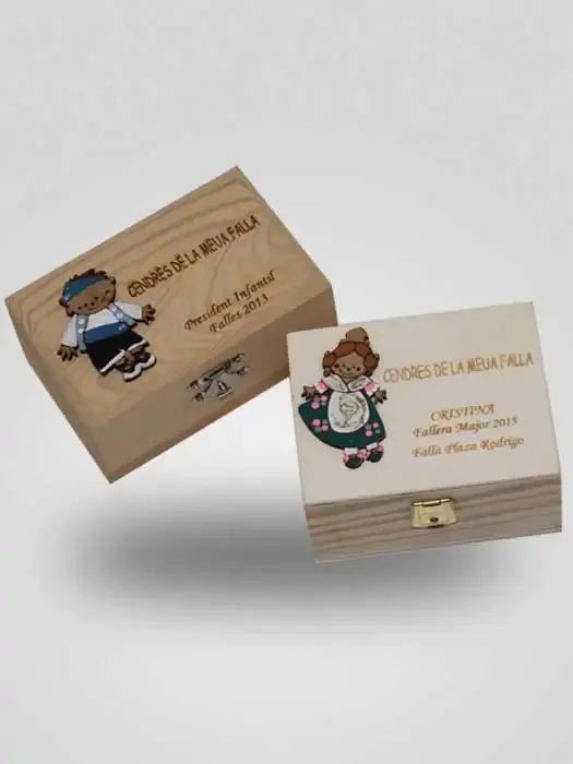 Caja Cenizas Falla, realizada con madera noble 100% acabado natural con grabación de textos proporcionados por el cliente (nombre, evento, etc…) y con silueta de Marieta o Guillem coloreados a mano.