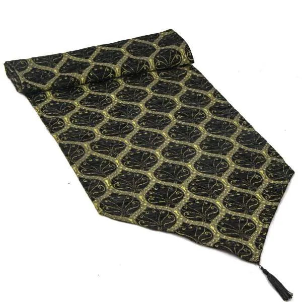 Camino de mesa de color negro, con motivos florales con tulipanes. Válido tanto para decorar una mesa como los pies de la cama, lleva flecos en los dos extremos, terminados en forma triangular.