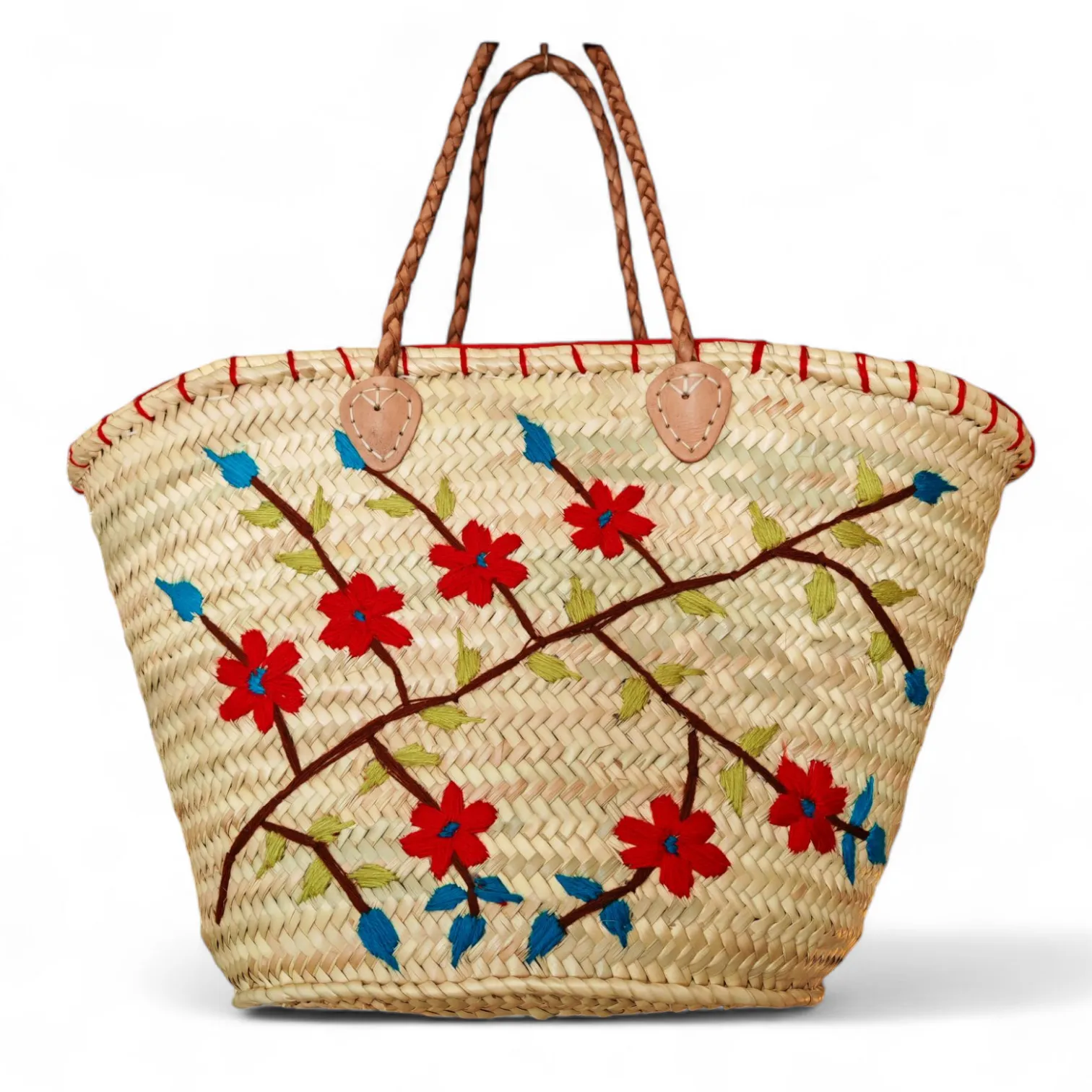 Capazo de palma con flores rojas, completamente realizado a mano de manera artesanal.