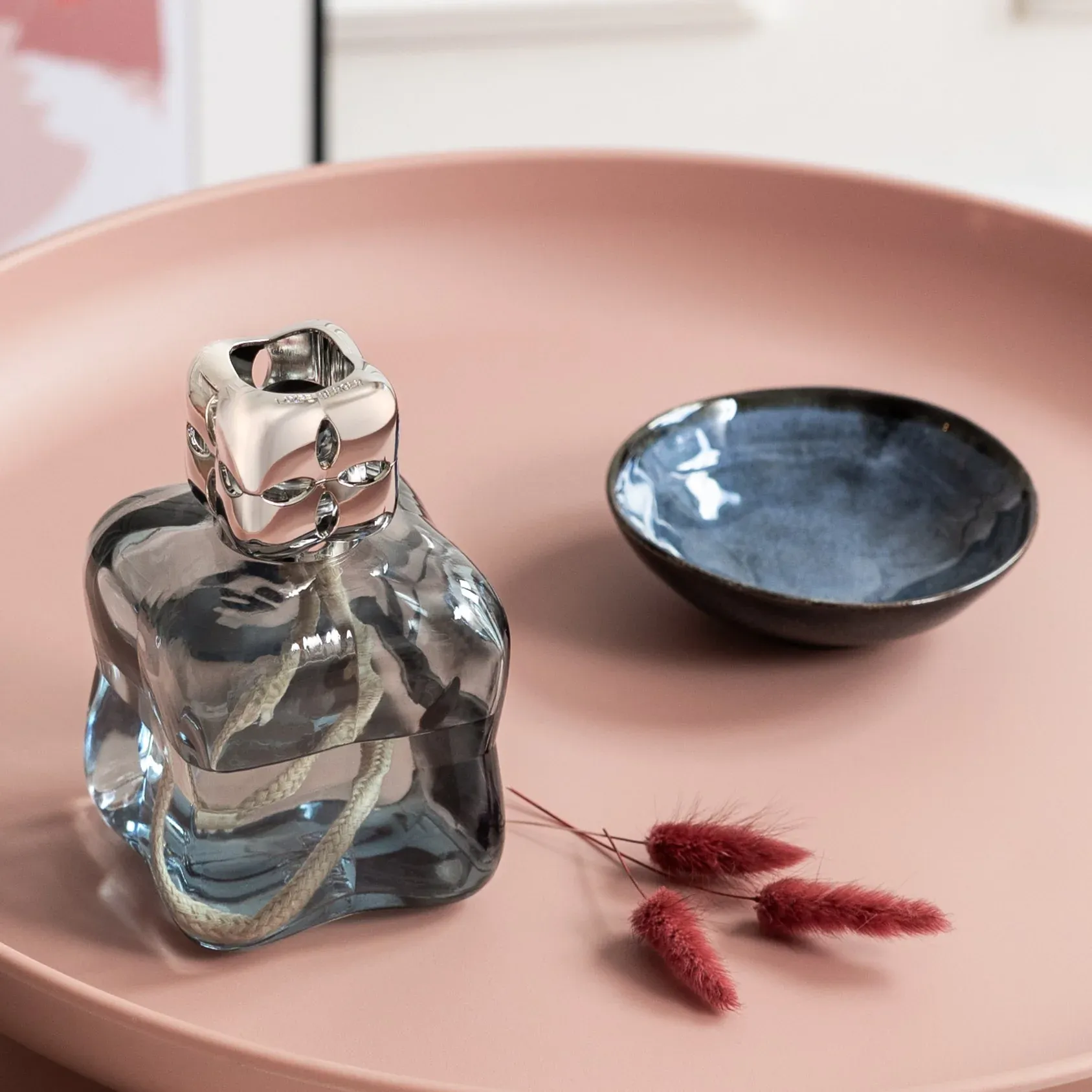 La lámpara Cosy inspirada en el confort y el bienestar de sentirse bien en casa. Con formas muy acogedoras en color Azul transparente y con el detalles de la flor en su capuchón. Además viene con el aroma Musc Cocoon. Un aroma acogedor y confortable. Sus notas de almizcles blancos combinados con sutiles notas florales hacen un perfume suave y perfecto para tardes en compañía. Lámpara de un tamaño generoso.