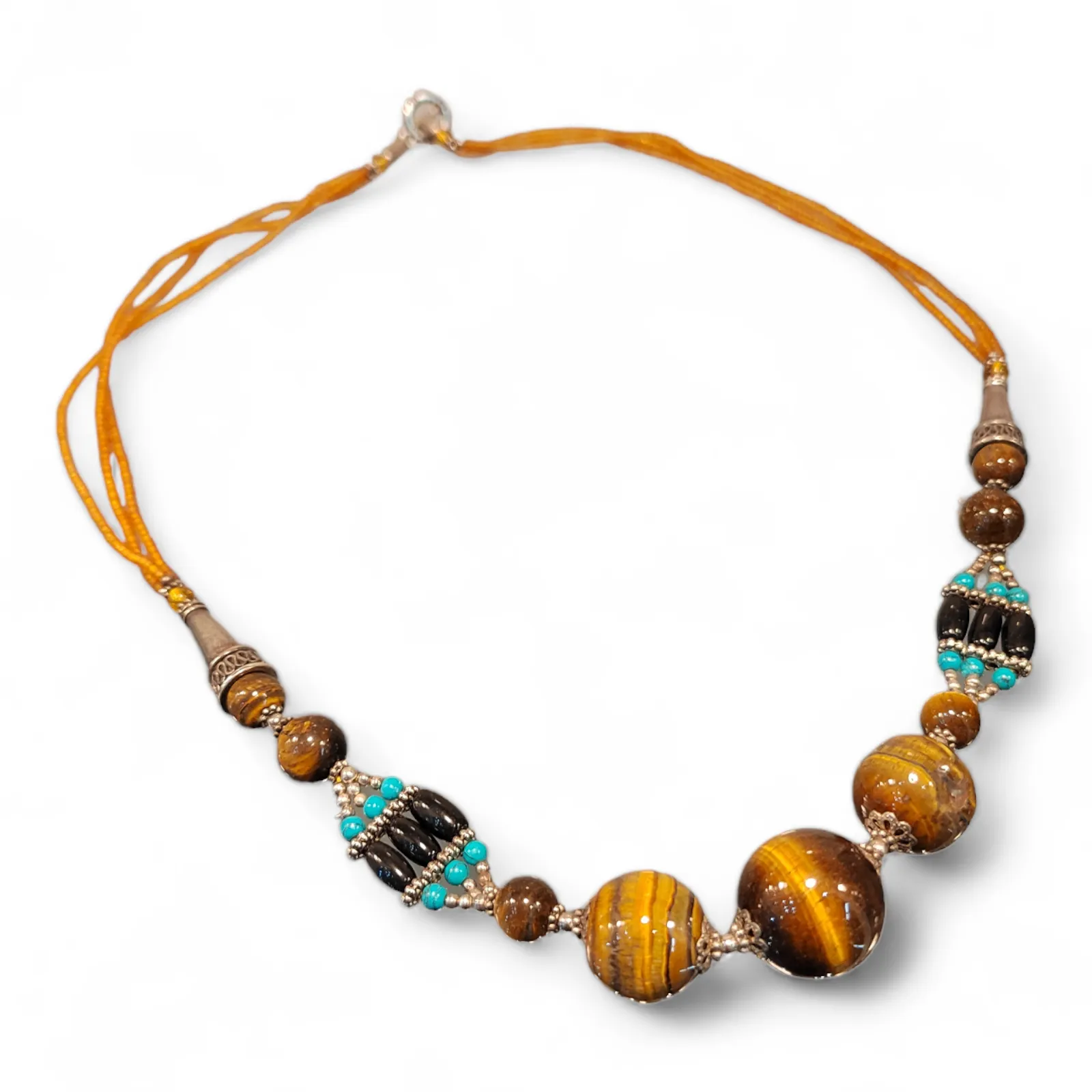 Sumérgete en la exquisita artesanía y la mística cultural con nuestro collar afgano de piedras Gunkuc, una pieza que captura la esencia de la elegancia étnica y la belleza atemporal. Este impresionante collar está elaborado con una cuidadosa selección de piedras naturales, incluyendo el ojo de tigre para la protección, el ónix para la fuerza, la turquesa para la sabiduría y la alpaca para una durabilidad incomparable.