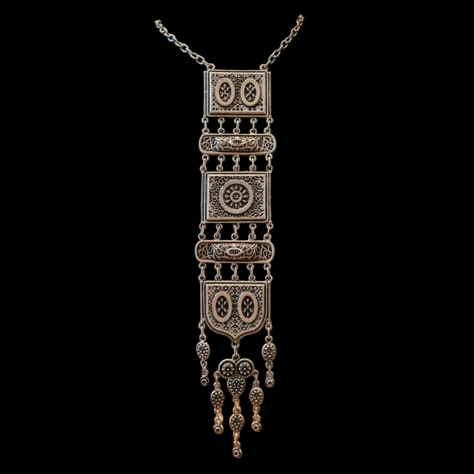 El collar presenta delicados grabados geométricos y florales típicos del arte turcomano, con ornamentos que recuerdan a las joyas portadas por los pueblos nómadas. La pieza destaca por sus colgantes en forma de medallones y amuletos, que representan protección y buena fortuna, valores fundamentales en la cultura otomana y turcomana. Este estilo combina detalles meticulosamente trabajados en zamak, con acabados envejecidos que dan un aspecto artesanal y místico a la pieza.