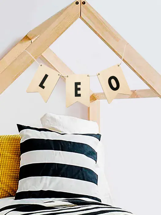 Banderines de cumpleaños, con nombre personalizado y en madera de haya con tipografía en Negro.