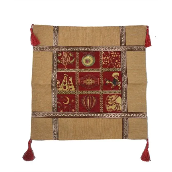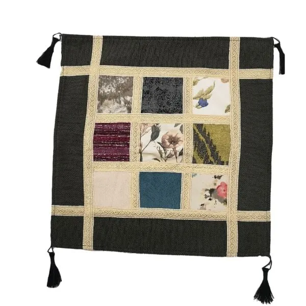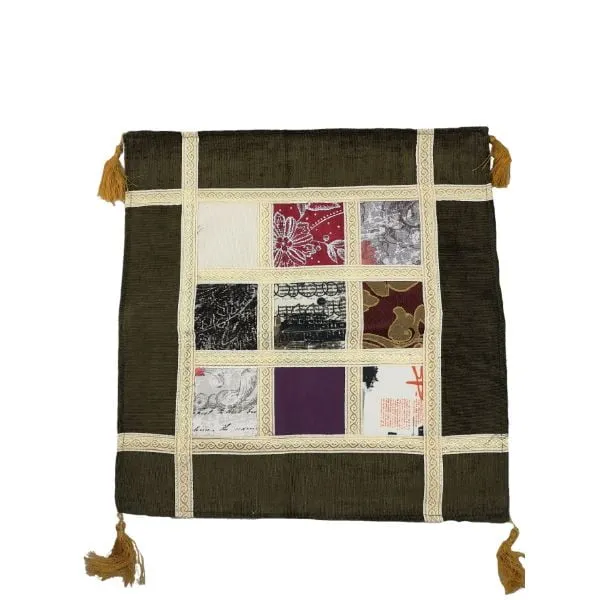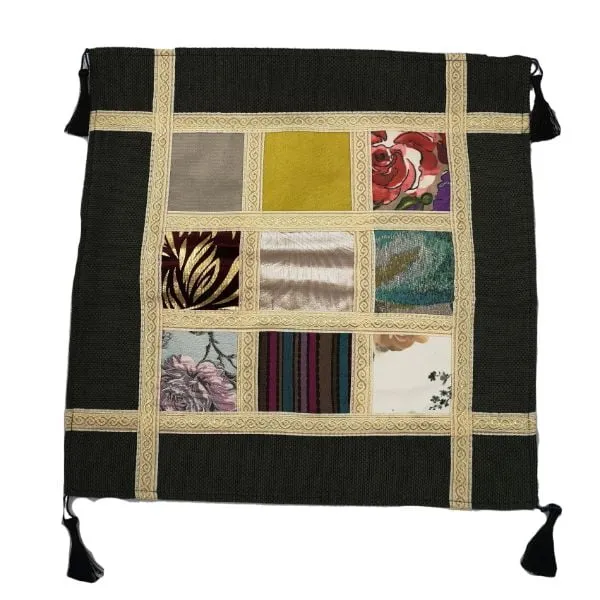 Elegante funda de cojín de chenilla, con pompones decorativos en sus esquinas. Realizados uniendo trozos de tela de diferentes colores y diseños, por lo que no hay dos absolutamente iguales.