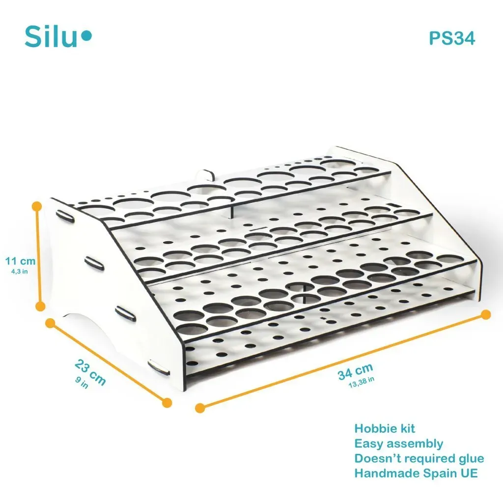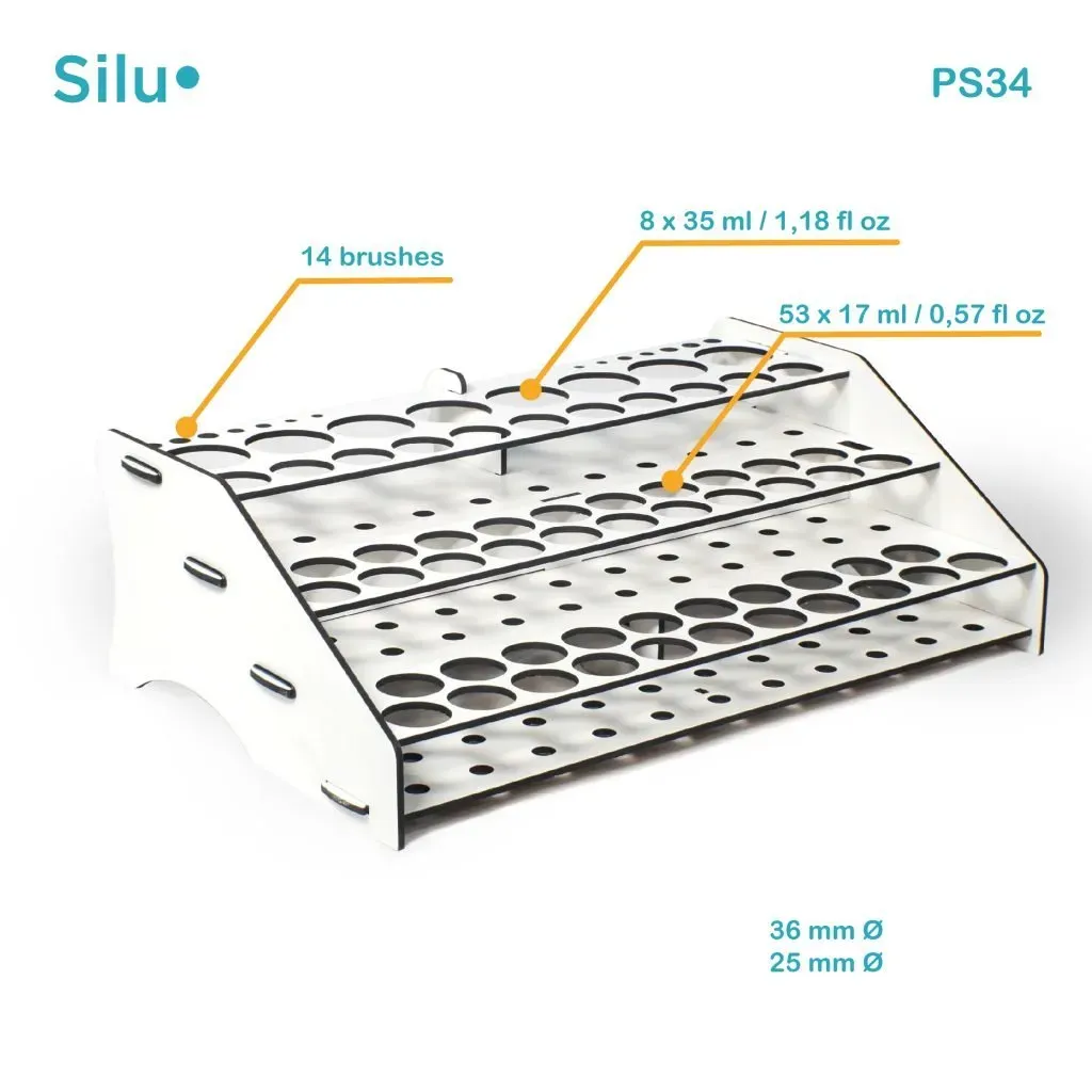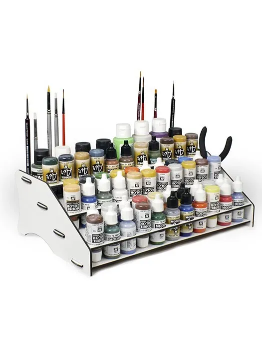 Este organizador de Pinturas Vallejo es perfecto para los profesionales de las maquetas y el modelismo. El Paint Stand Recto Mediano tiene capacidad para 53 botes de 17 ml, 8 de 35 ml (0,57 fl oz, 1,18 fl oz o 2,02 fl oz) y 14 pinceles.