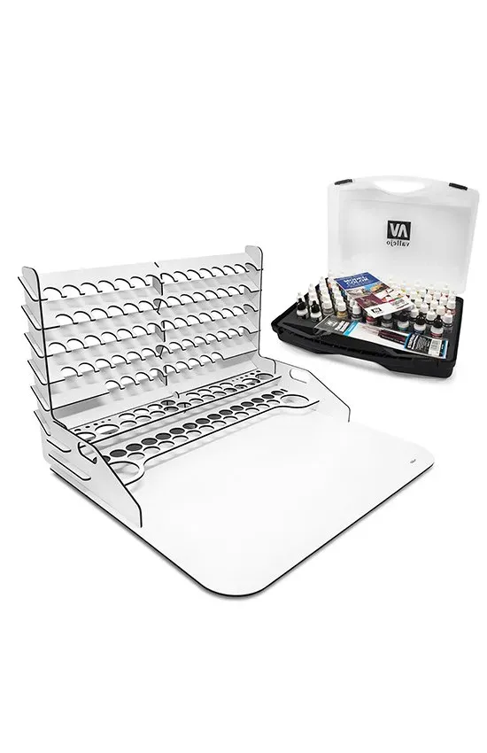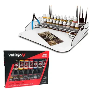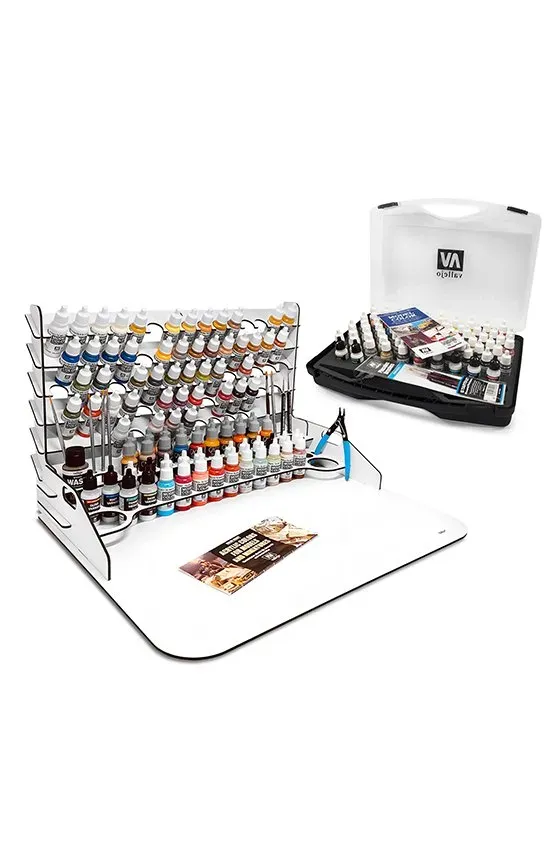 - El maletín de pinturas Vallejo incluye 67 colores básicos, 1 medium, 3 barnices, 1 diluyente, 3 pinceles sintéticos y una carta de colores. (REF:VAL-70172)