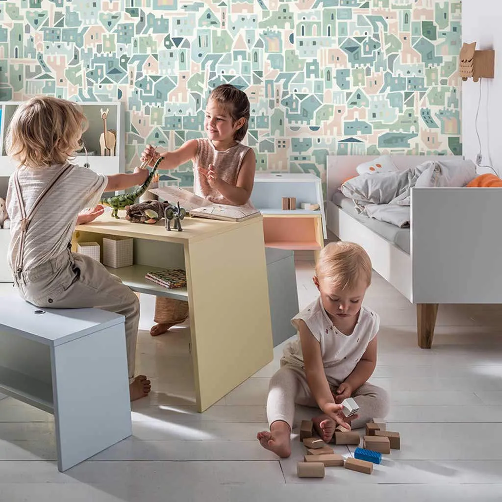 El Panel Geometric Houses Tuli tiene un diseño alegre y divertido de estilo naif para estancias infantiles. Combina tonalidades pastel que combinan en distintos tipos de estilos decorativos.