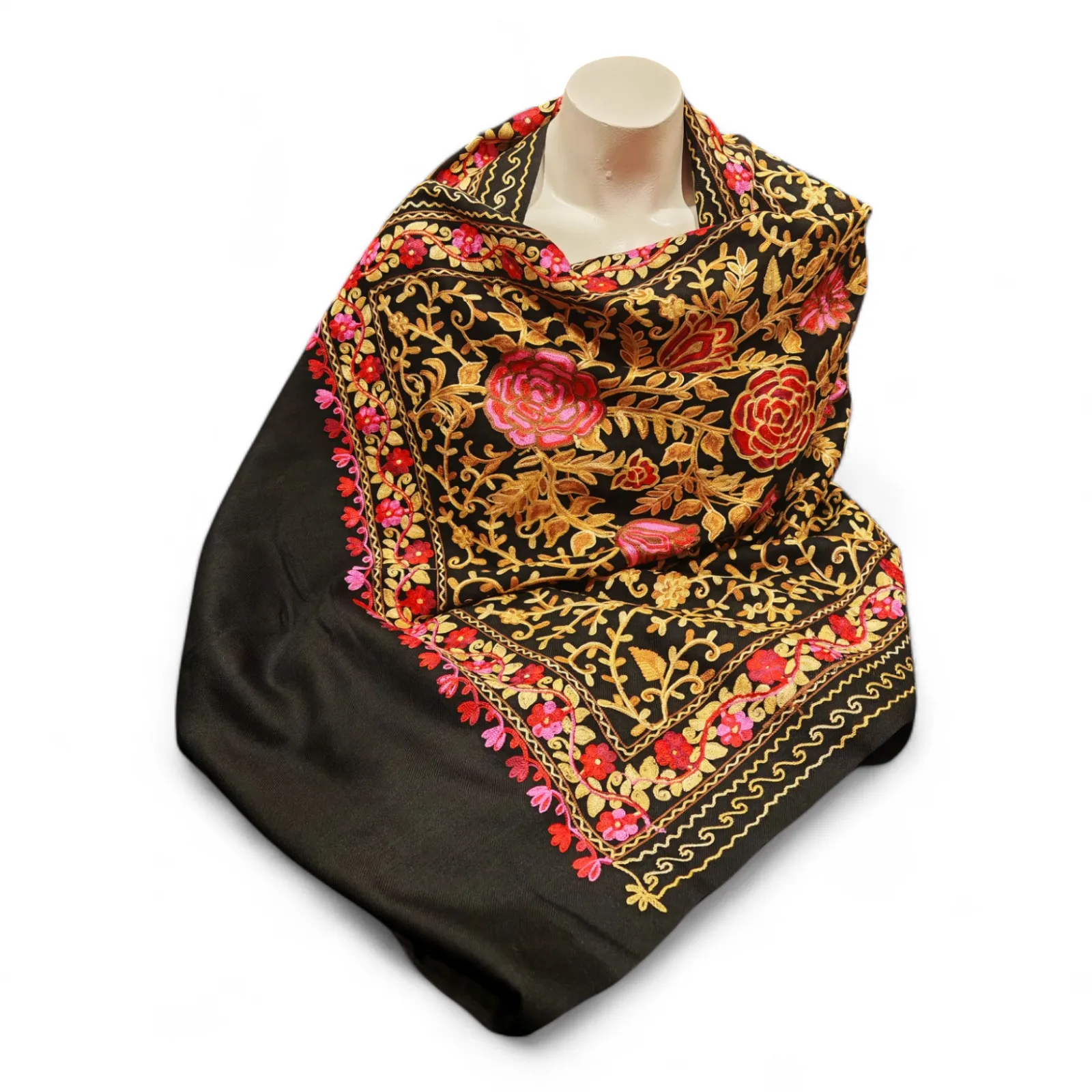 Esta exquisita pashmina está confeccionada con lana fina del Himalaya, reconocida por su suavidad, calidez y calidad inigualable. La pieza destaca por su bordado aari, un arte tradicional originario de la región de Gujarat, India. Este bordado se caracteriza por sus intrincados patrones florales y diseños delicados.