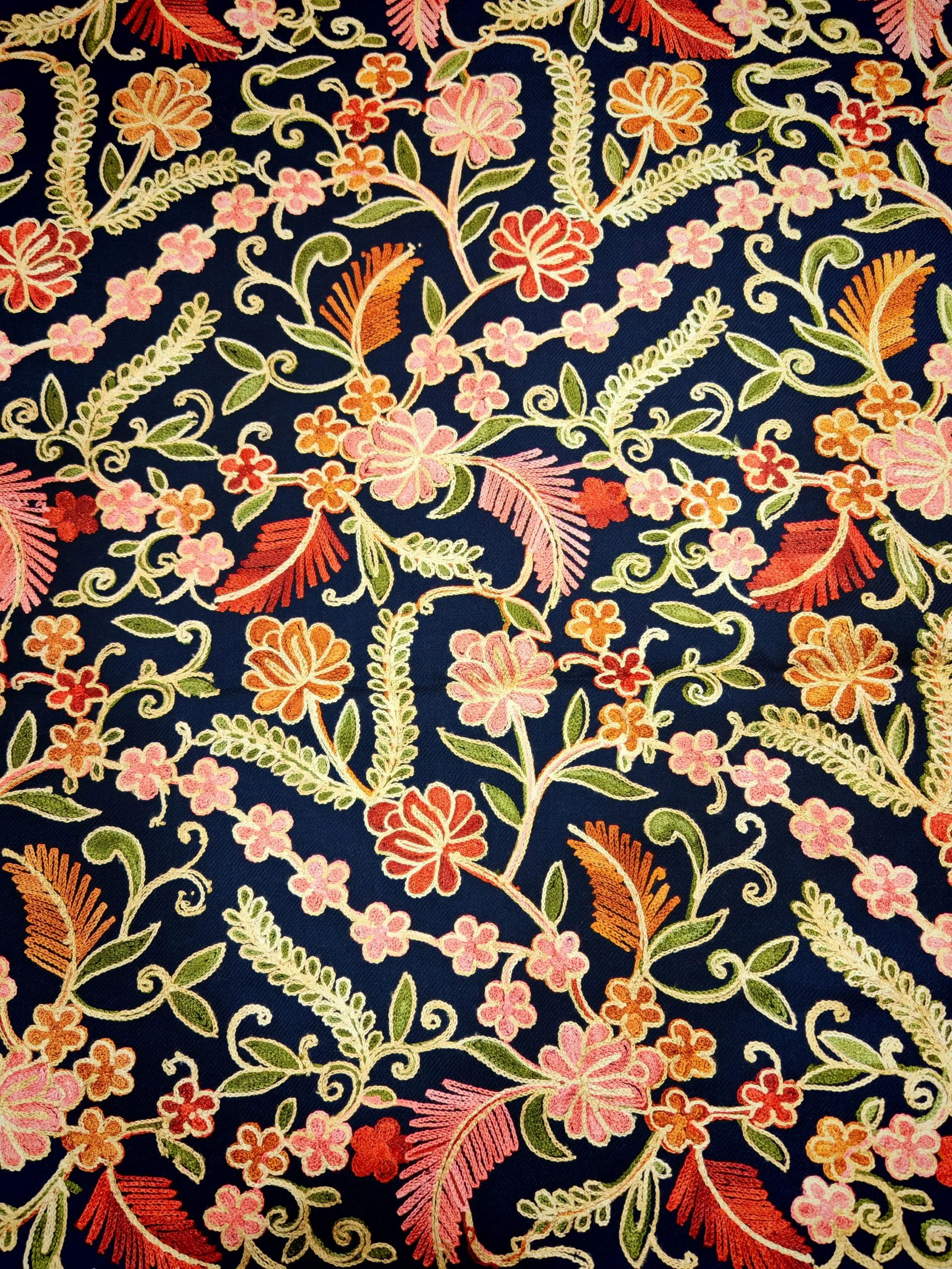 Los bordados aari, con raíces en la época mogol, son apreciados por la meticulosa técnica que exige una extraordinaria atención al detalle. En esta pashmina, el aari complementa la elegancia natural de la lana, haciendo de ella una prenda perfecta para añadir un toque de lujo a cualquier atuendo, mientras mantiene viva una rica tradición cultural.