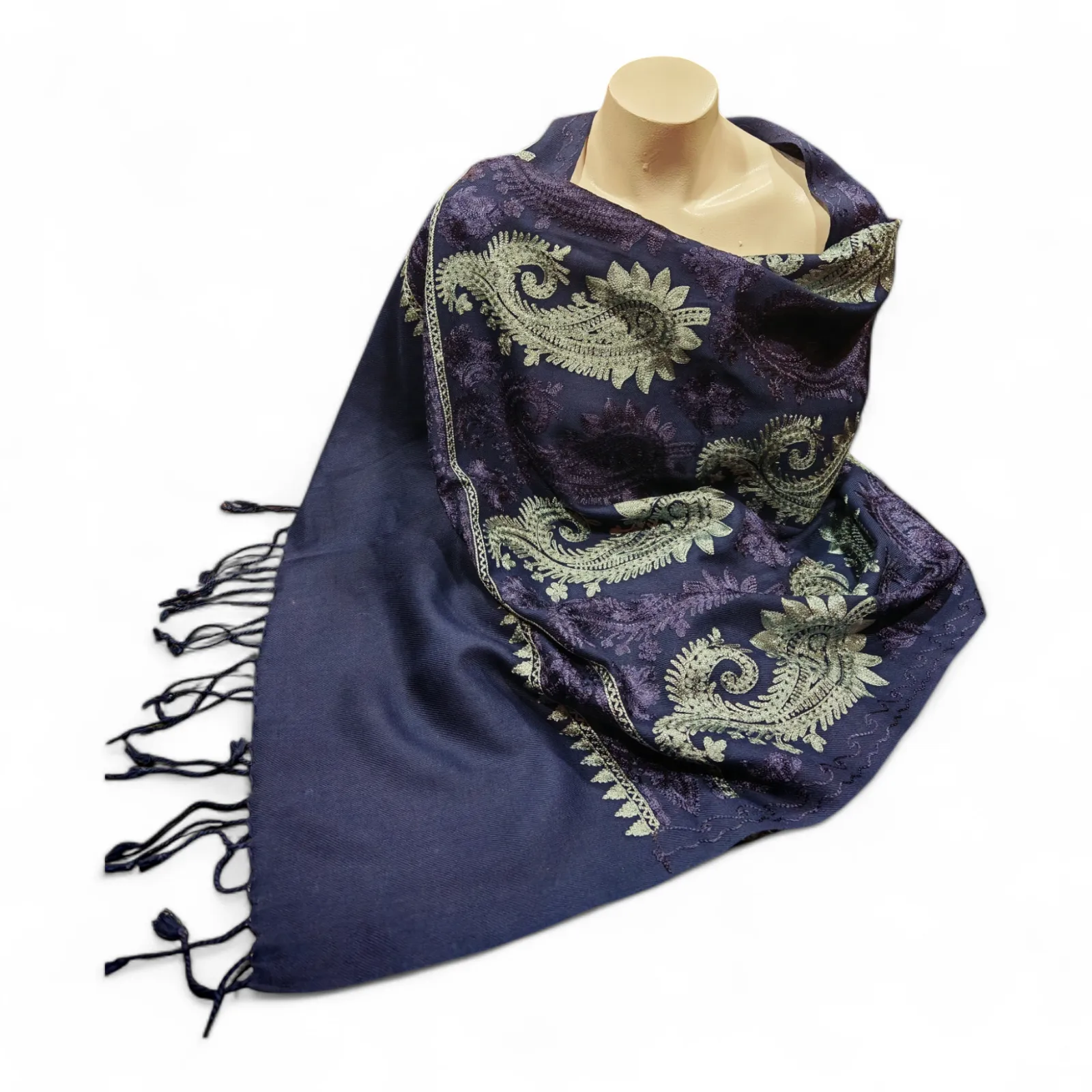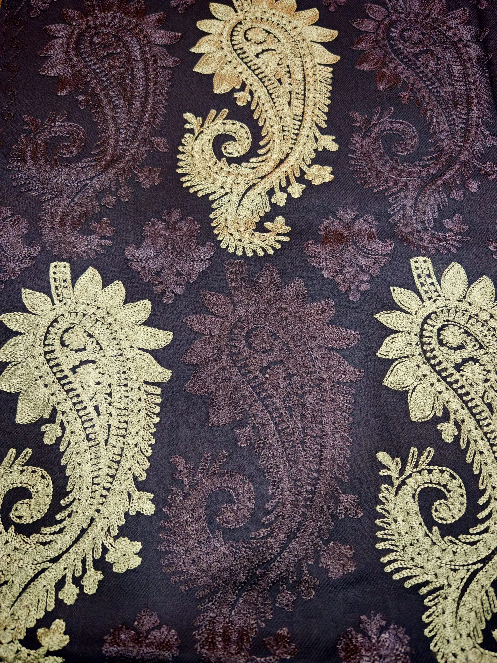 Los bordados aari, con raíces en la época mogol, son apreciados por la meticulosa técnica que exige una extraordinaria atención al detalle. En esta pashmina, el aari complementa la elegancia natural de la lana, haciendo de ella una prenda perfecta para añadir un toque de lujo a cualquier atuendo, mientras mantiene viva una rica tradición cultural.
