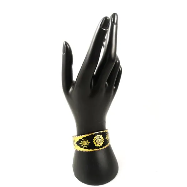 Espectacular y ligera pulsera, realizada en cobre, una fina plancha, por lo que resulta muy ligera, lacada en una de sus superficies, en la que destacan los dibujos vegetales o con grecas y sus vistosos colores. Tras haber sido pintada su superficie, el artesano con un minúsculo cincel, resalta el color cobre del fondo, haciendo pequeñas muescas en la superficie.