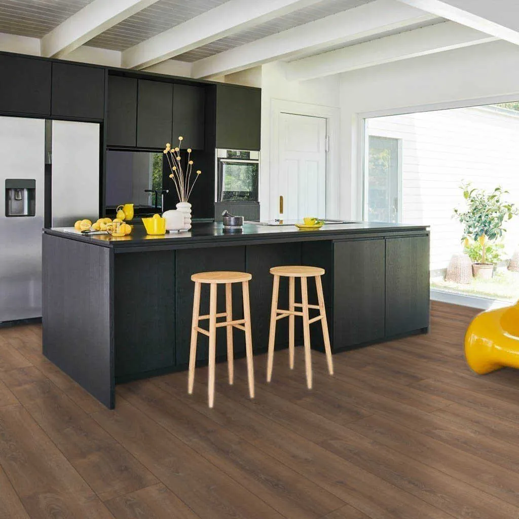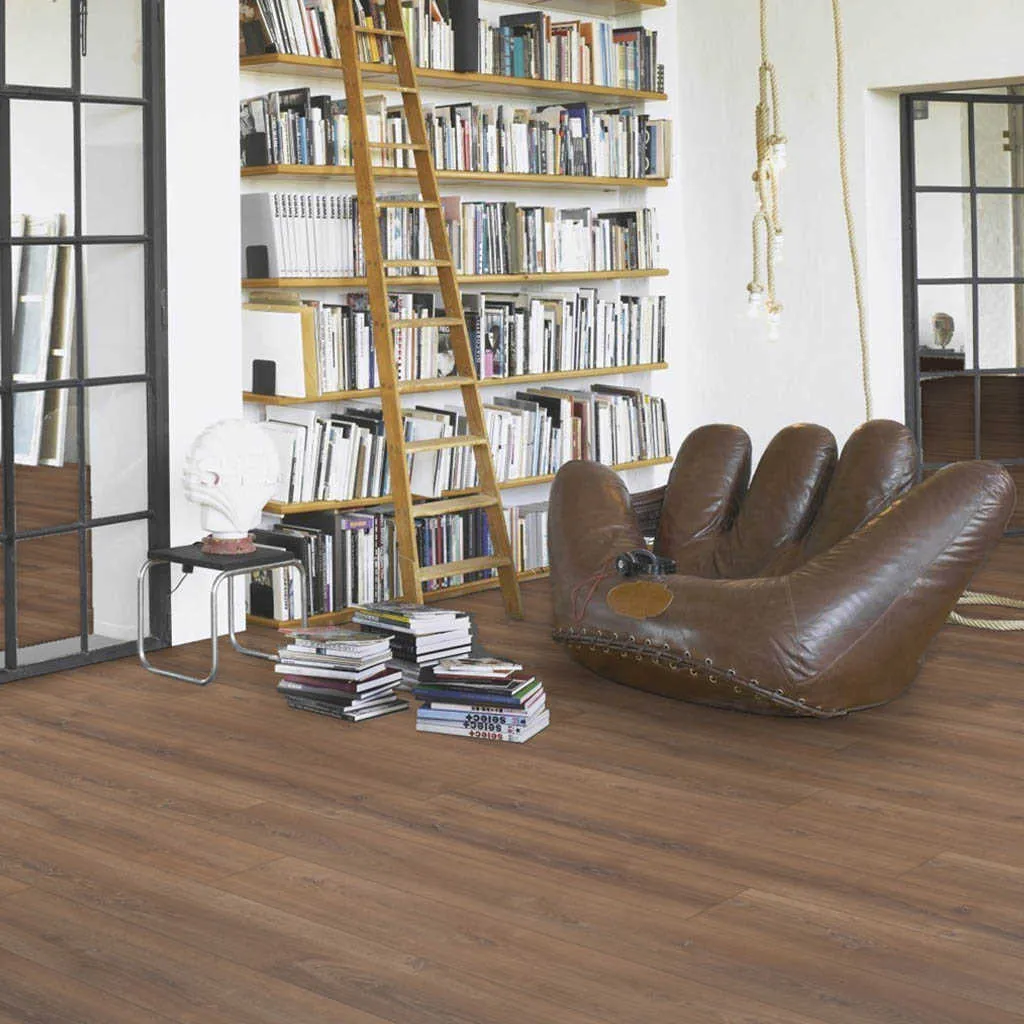 La tonalidad marrón del roble aporta una gran calidez al ambiente. El carácter noble de la madera en su aspecto más natural, se acentúa en este laminado que recrea con gran realismo las vetas y los nudos de la madera de roble. El modelo Roble Montana Calizo combina muy bien en estilos decorativos clásicos y tradicionales, donde aporta un toque de distinción y exclusividad. Para lograr contraste con el resto de la decoración, escoge el mobiliario en tonos más oscuros. Y para darle mayor luminosidad al espacio, decántate por los textiles en cortinas y estores de tonos claros y beige. Lograrás un excelente resultado.