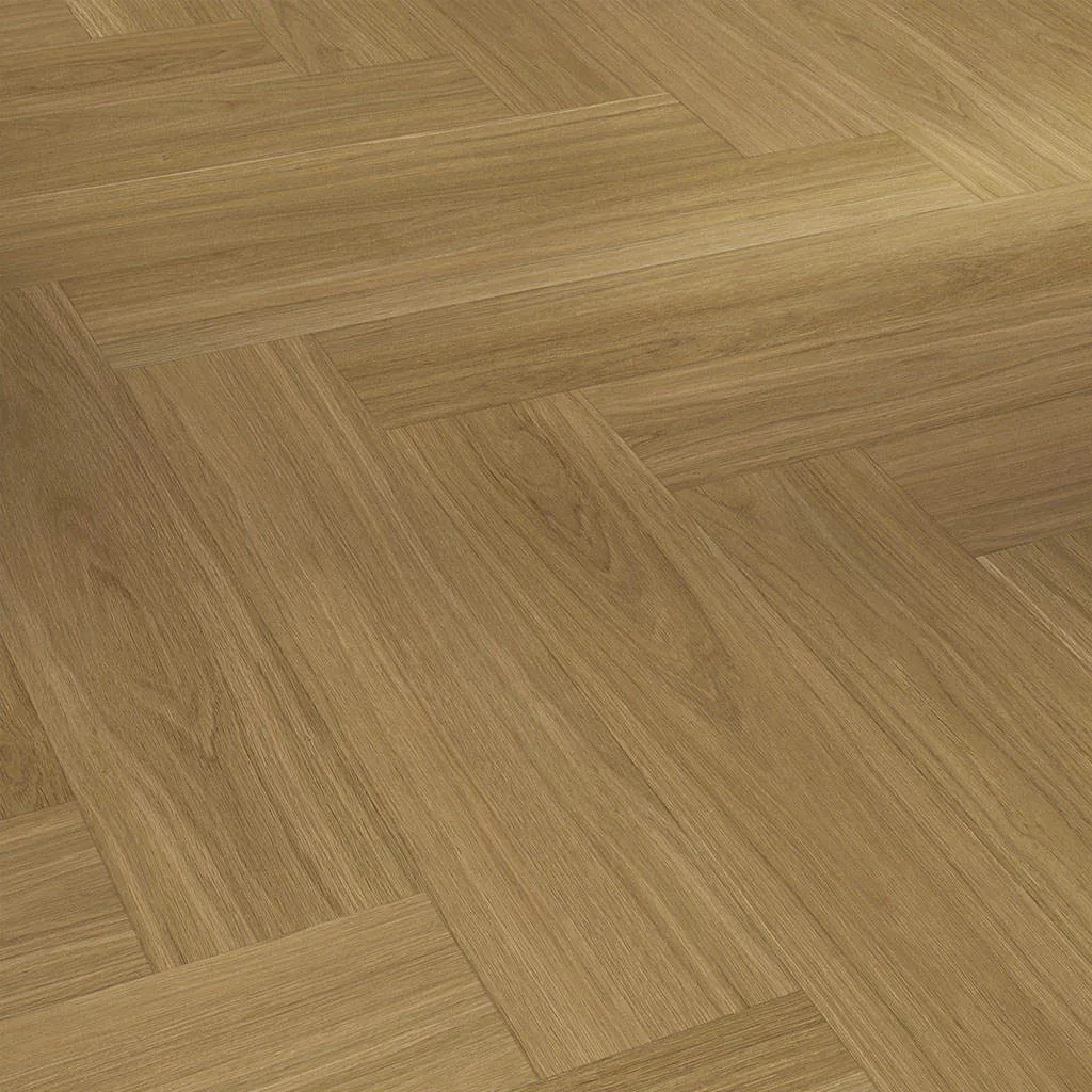 El color marrón en tono caramelo del roble, en una tonalidad media, lo hace idóneo para espacios más amplios, cuando quieras lograr un ambiente más acogedor y cálido. El atractivo de las vetas y nudos de la madera de roble quedan perfectamente plasmados en este suelo vinílico de formato espiga, con un aire clásico que combina a la perfección con estilos más tradicionales y clásicos. Para conseguir el contrapunto con la decoración, escoge el mobiliario y los textiles en tonos más claros. Así lograrás un mayor contraste y un resultado muy atractivo.
