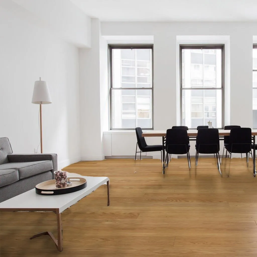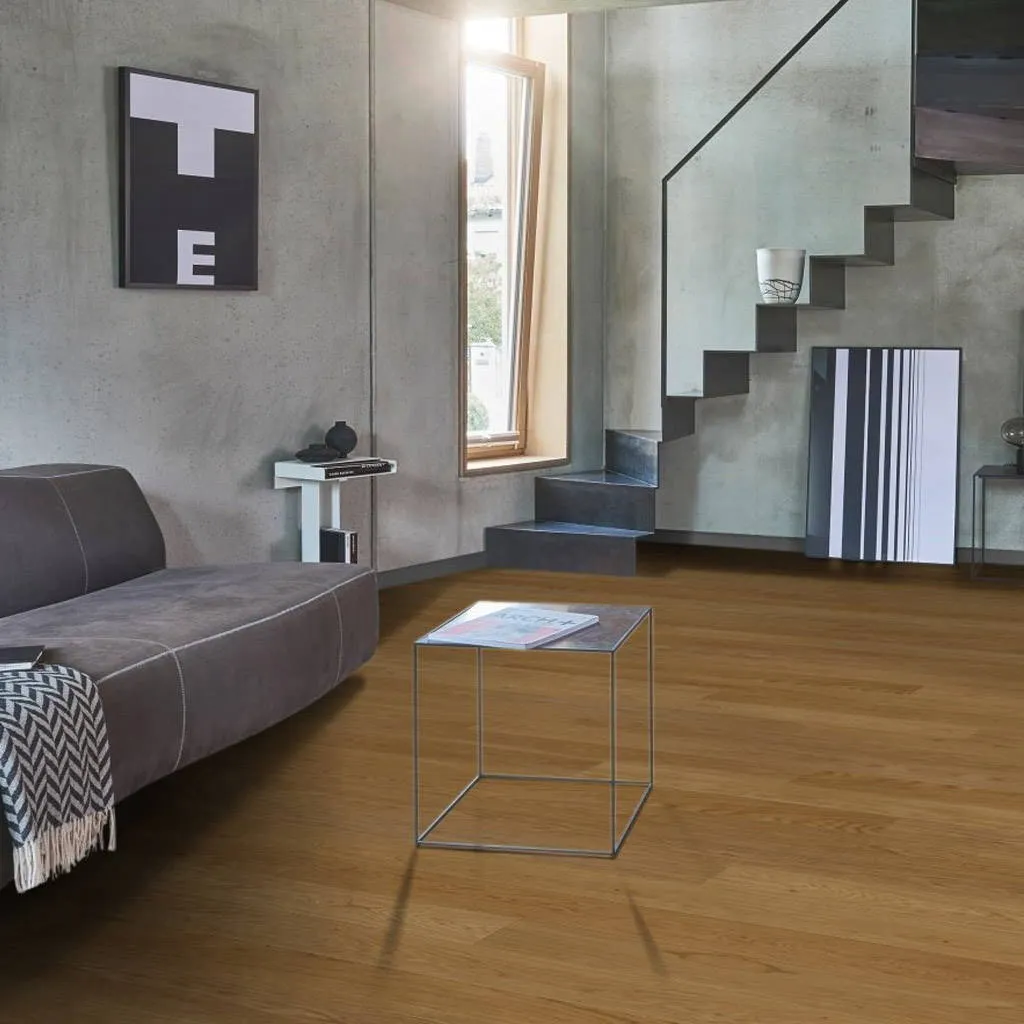 El color marrón roble de este suelo de madera, con bonitos contrastes en tono caramelo, lo hace perfecto para ambientes tradicionales y rústicos. La belleza de esta madera crea ambientes únicos con gran personalidad. Puedes colocarlo tanto en espacios amplios como reducidos. Crea un ambiente cálido y acogedor. El atractivo de las vetas y nudos de la madera de roble le aportan un toque muy personal. Para conseguir el contrapunto con la decoración y crear un bonito contraste, escoge el mobiliario y los textiles en tonos más claros. Así lograrás un mayor contraste y un resultado muy atractivo.