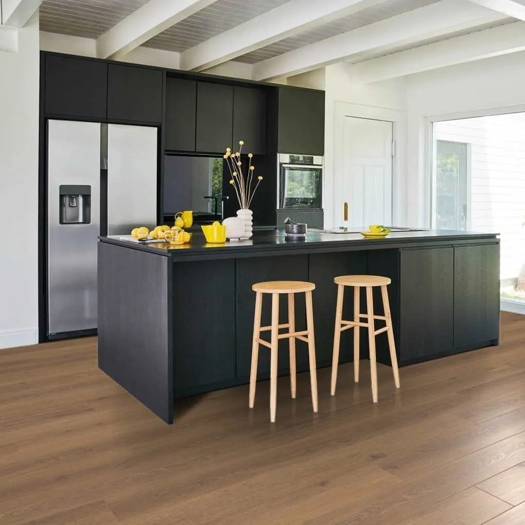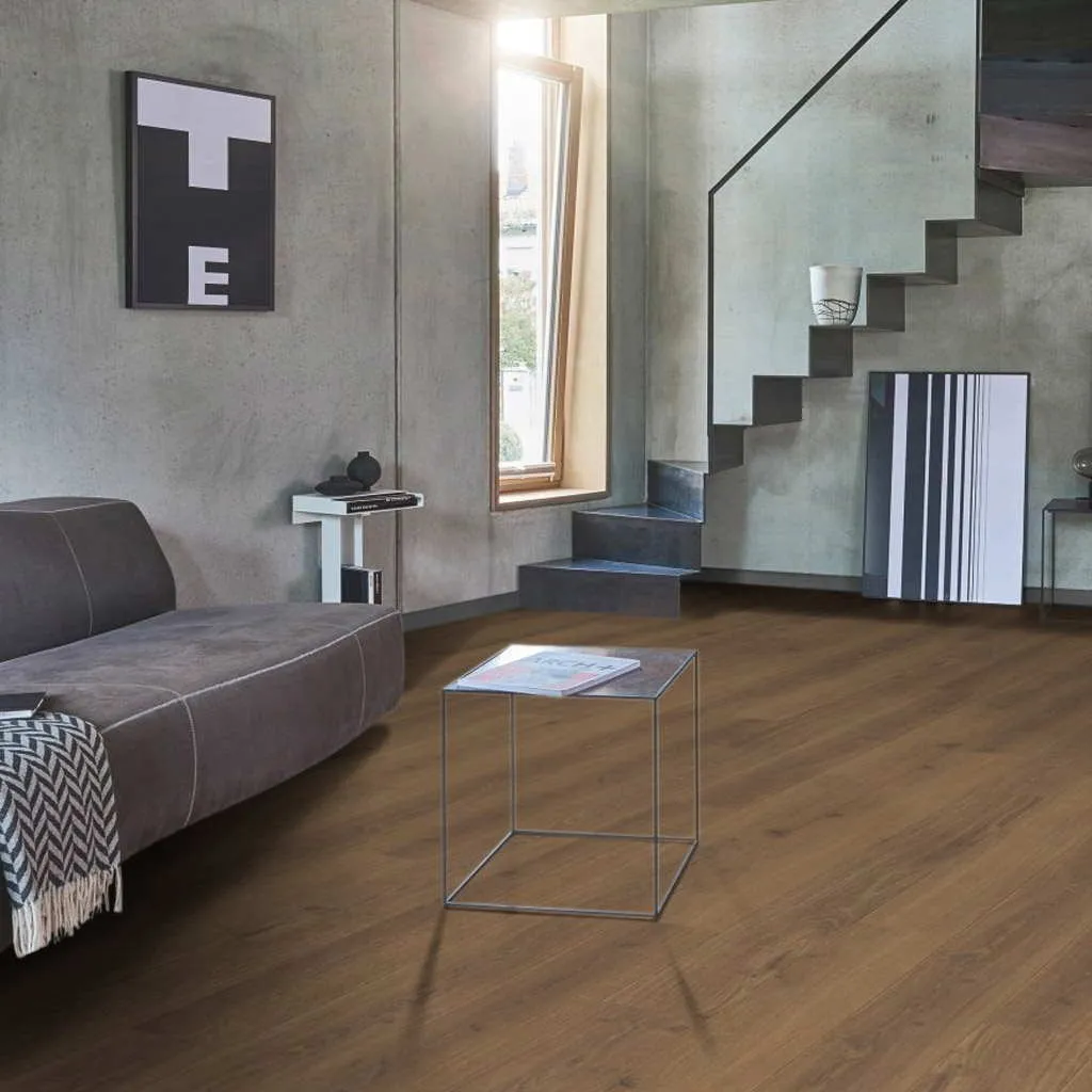 La tonalidad más oscura del marrón del roble consigue un efecto de originalidad y autenticidad, que se ve resaltado por el realista dibujo de las vetas y los nudos. Es un laminado ideal para espacios amplios, donde crea un ambiente cálido y acogedor. Si quieres instalarlo en espacios más reducidos, asegura que reciba mucha luz natural, y combínalo con muebles en tonos claros. Una forma de crear un bonito contraste, es escogiendo la decoración y otros elementos en tonos fuera de la gama del marrón. Los estores y cortinas siempre en tonalidades claras para dar luminosidad a todo el espacio.