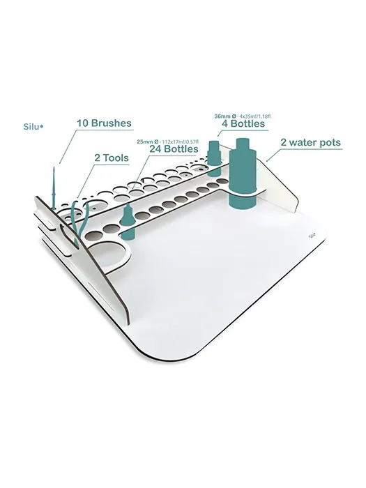 - capacidad para 24 botes de 17 ml, 4 de 35 ml ó 60 ml, 2 de 200 ml, y 10 pinceles.