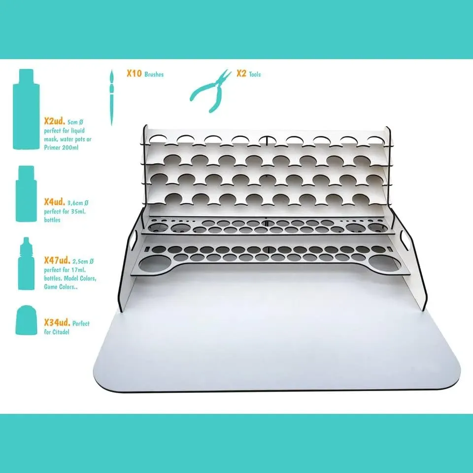 Set Xpress Color Vallejo Paint Station, Nueva gama xpress color de Vallejo, perfecta para pintar rápidamente todo tipo de figuras. Su característica principal es su excelente capilaridad, que permite al color deslizarse fácilmente por la superficie de la miniatura, depositándose en todos los relieves, y con más intensidad, en las hendiduras de la figura. La estación de trabajo tiene una capacidad para alojar 45 botes de 17/18 cm, 4 botes de 35/60 ml y 2 de 200 ml de pinturas Vallejo, la extensión puede albergar hasta 34 botes de pinturas citadel, también puedes organizar tus pinceles y herramientas. Referencias de pinturas: Blanco templario 72.401; Piel de enano 72.402; Amarillo imperial 72.403; Amarillo nuclear 72.404; Naranja Marte 72.405; Rojo Plasma 72.406; Rojo Terciopelo 72.407; Púrpura Cardenal 72.408; Púrpura oscuro 72.409; Violeta tenebroso 72.410; Azul Místico 72.411; Azul Tormenta 72.412; Azul Omega 72.413; Turquesa Caribe 72.414; Piel de Orco 72.415; Verde Trol 72.416; Verde Serpiente 72.417; Verde Lagarto 72.418; Verde Plaga 72.419; Marrón Yelmo 72.420; Marrón Cobrizo 72.421; Gris Espacial 72.422; Magnolia Negra 72.423; Medium Xpress 72.448