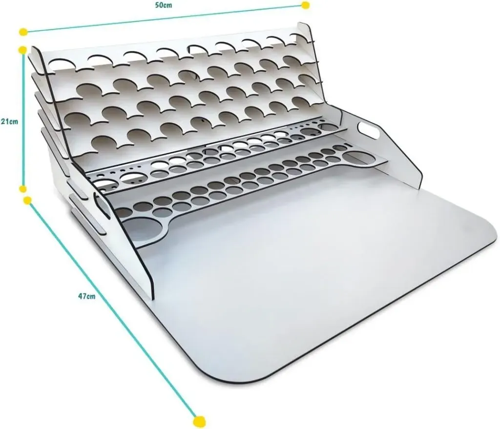 [MEDIDAS] Este organizador de pintura tiene unas medidas de 50 x 41,5 x 29,5 cm, con una capacidad de 112 botes de 17/18 ml, 4 botes de 35/60 ml y 2 de 200 ml, también tiene capacidad para 10 pinceles de diferentes tamaño y herraminetas.