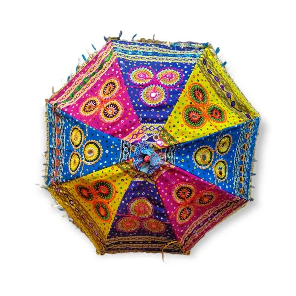 Preciosa y animada sombrilla de India, de alegres colores.