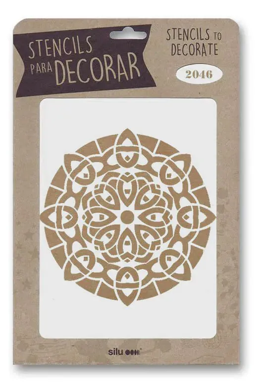 Plantilla stencil mandala 2046, de medidas 125mm x 250mm, en superficie traslucida y flexible de alta calidad cortadas a láser con la máxima precisión. Para realizar estarcido aplicando sobre cualquier superficie limpia y seca. Dispones infinidad de modelos que pueden combinarse entre sí.