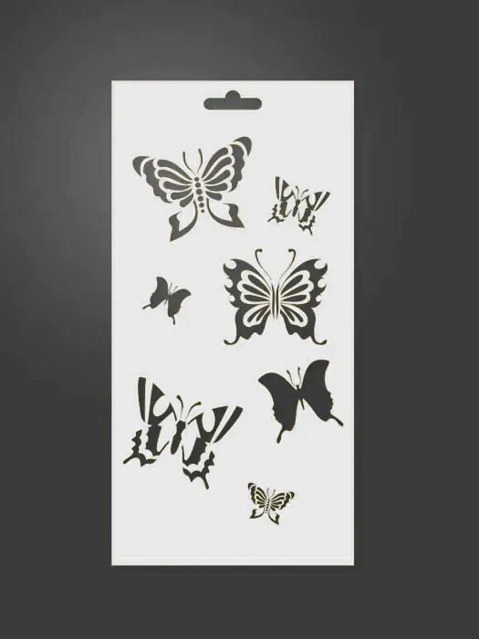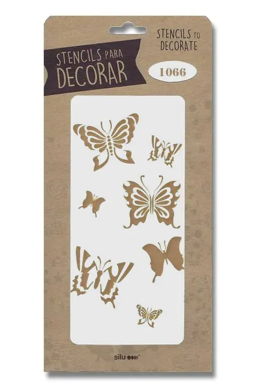 Plantilla stencil con motivo mariposas, de medidas 125mm x 250mm, en superficie traslucida y flexible de alta calidad cortadas a láser con la máxima precisión. Para realizar estarcido aplicando sobre cualquier superficie limpia y seca. Dispones infinidad de modelos que pueden combinarse entre sí.