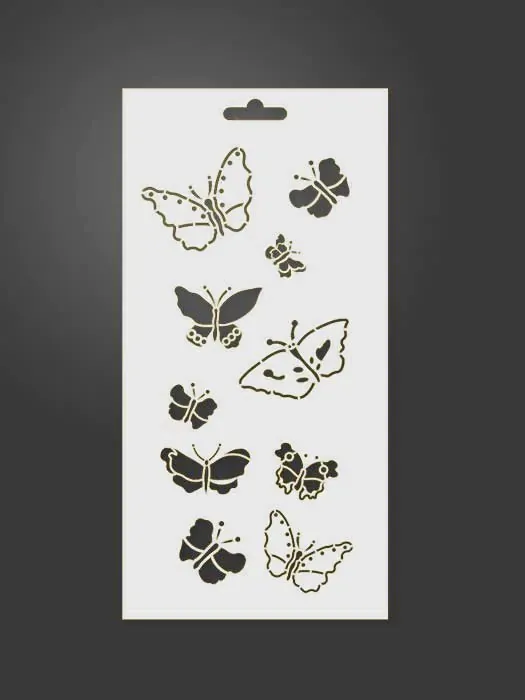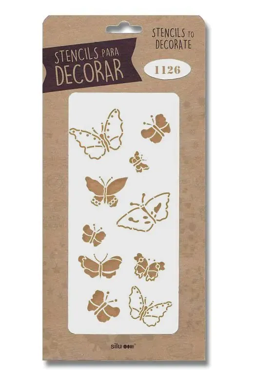 Plantilla stencil con motivo mariposas, de medidas 125mm x 250mm, en superficie traslucida y flexible de alta calidad cortadas a láser con la máxima precisión. Para realizar estarcido aplicando sobre cualquier superficie limpia y seca. Dispones infinidad de modelos que pueden combinarse entre sí.