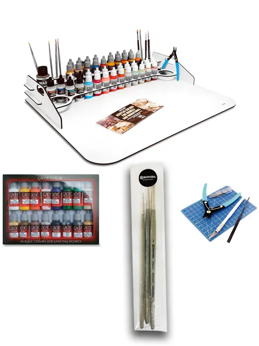 - El kit incluye un estuche de 16 Pinturas GameColor de Vallejo (Ref: 72.299); Set de Pinceles Escoda, alicates de corte, cutter núm 1 con 5 cuchillas, superficie de corte y lima plana.