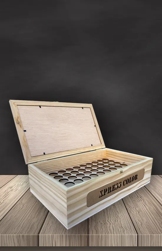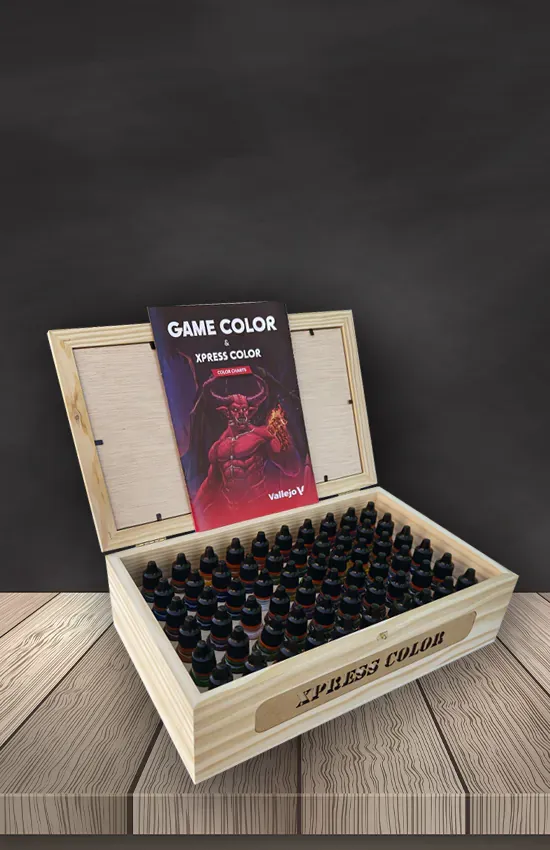- ESTUCHE: Este pack de edición limitada viene presentado en un nuevo estuche de madera, resistente y portátil. La caja está elaborada con madera noble 100% acabado natural y proviene de bosques sostenibles con el medio ambiente. En el frontal viene identificado «Xpress Color» cortado a láser. El interior contiene una madera para colocar los botes de pinturas Xpress Color de Vallejo y evitar que se caigan y se puedan transportar con seguridad.